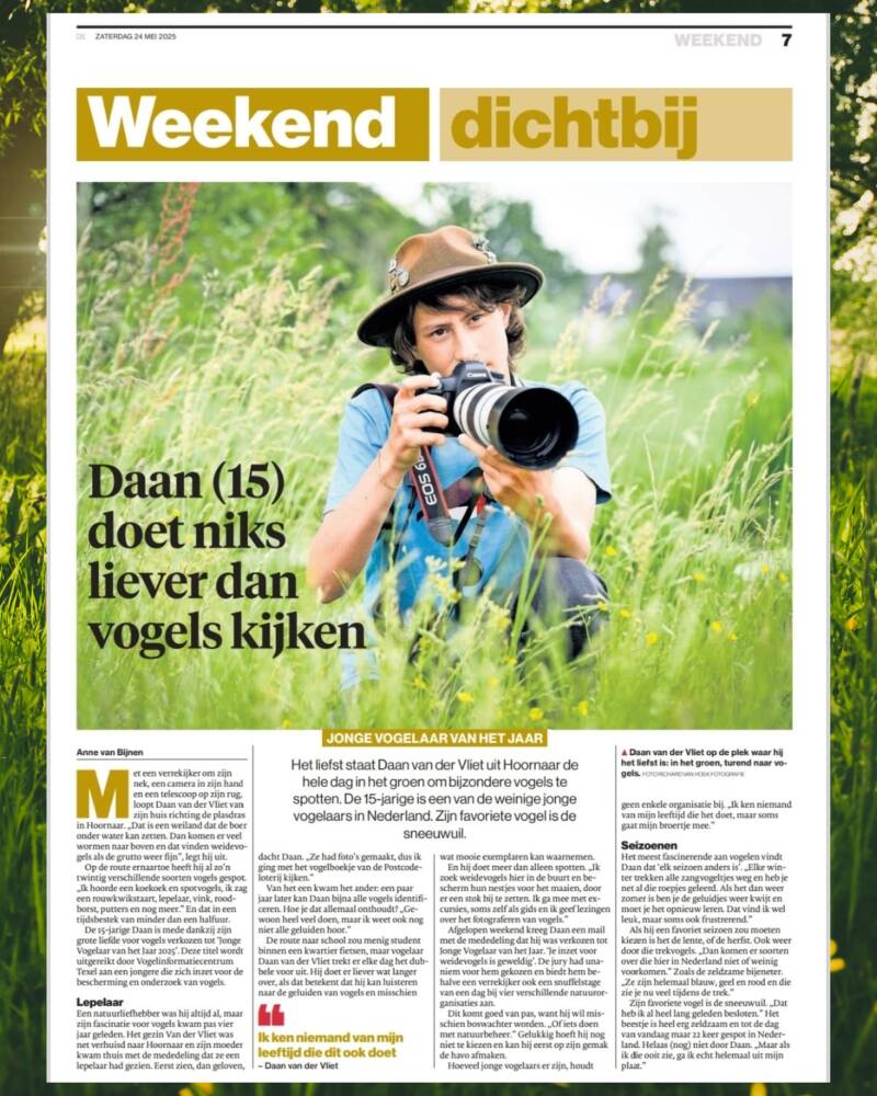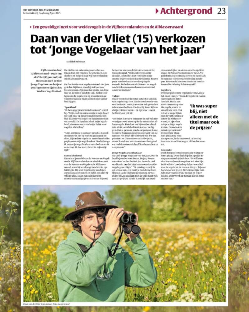 In het voorjaar van 2025 ben ik tijdens het Waddenvogelfestival uitgeroepen tot 'Jonge vogelaar van het jaar'. Ik ontving deze eretitel voor alles wat ik doe om vogels te beschermen, ontdekken en helpen. Naast de titel heb ik ook een mooie verrekijker gewonnen en vier stages bij natuurorganisaties.